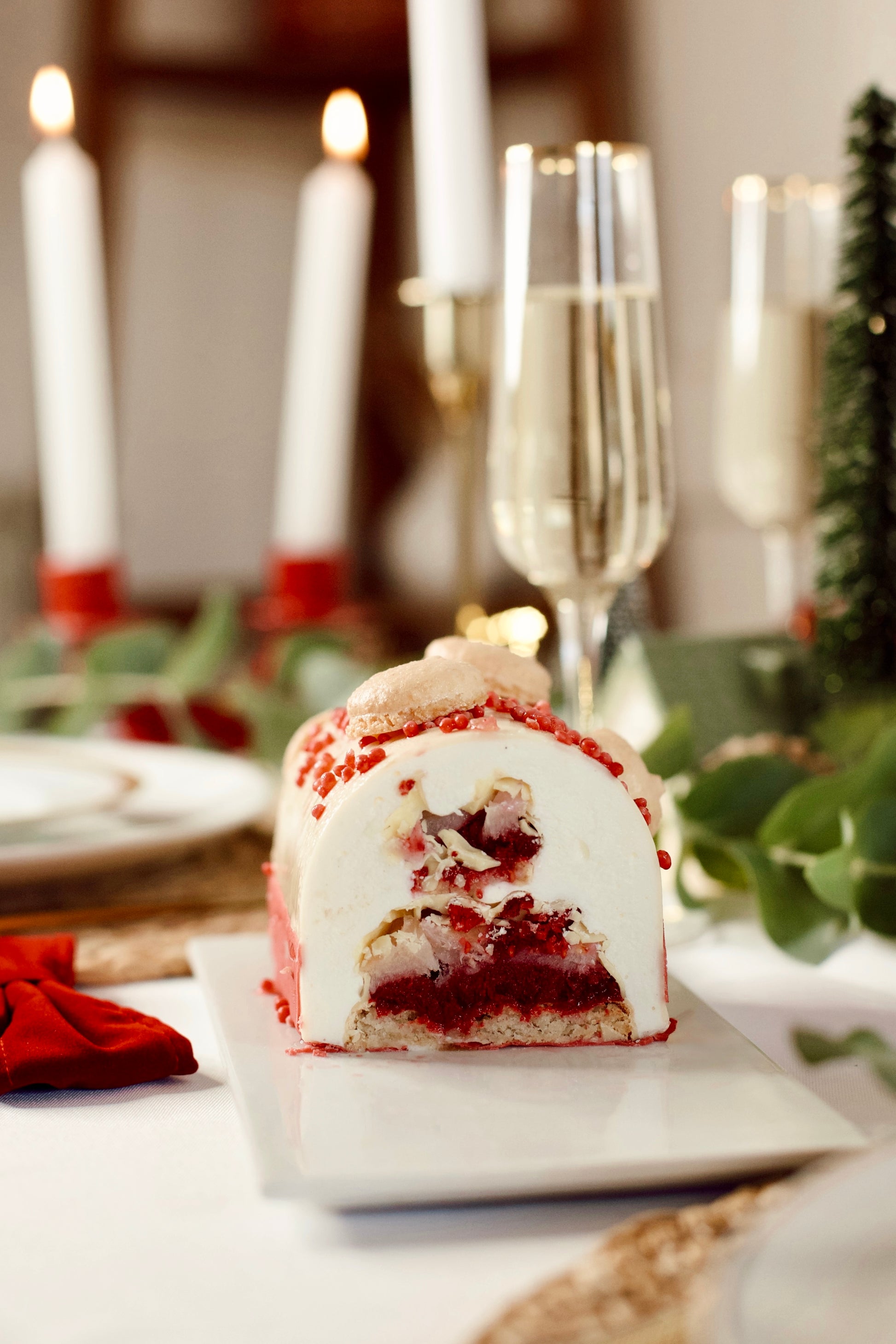 Biscuit macaron, confit framboise, mousse yaourt légère, brisures de framboise, litchi en morceaux.