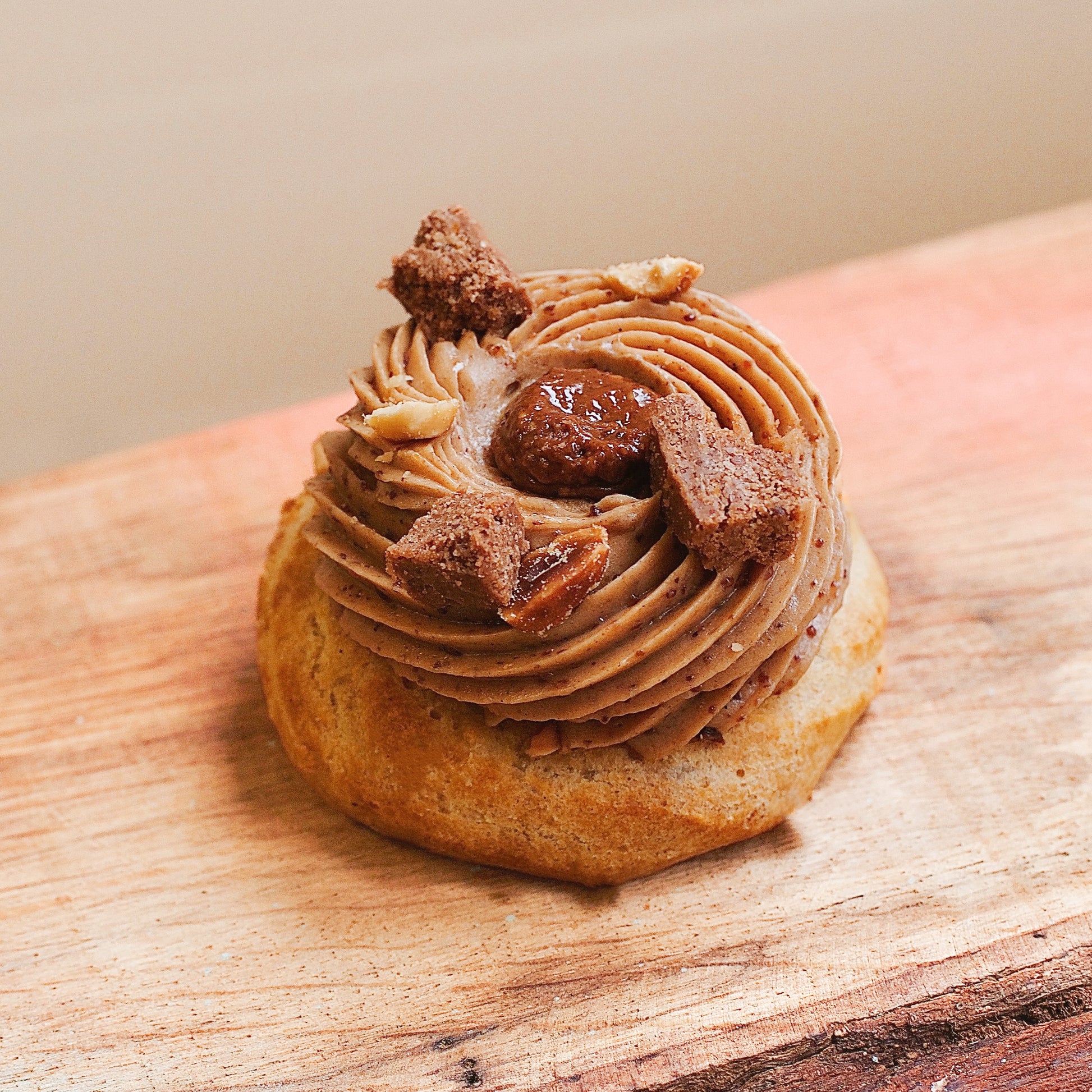 Pâte à choux, praliné amande-noisette, crème mousseline pralin, noisettes concassées, praliné noisette maison
