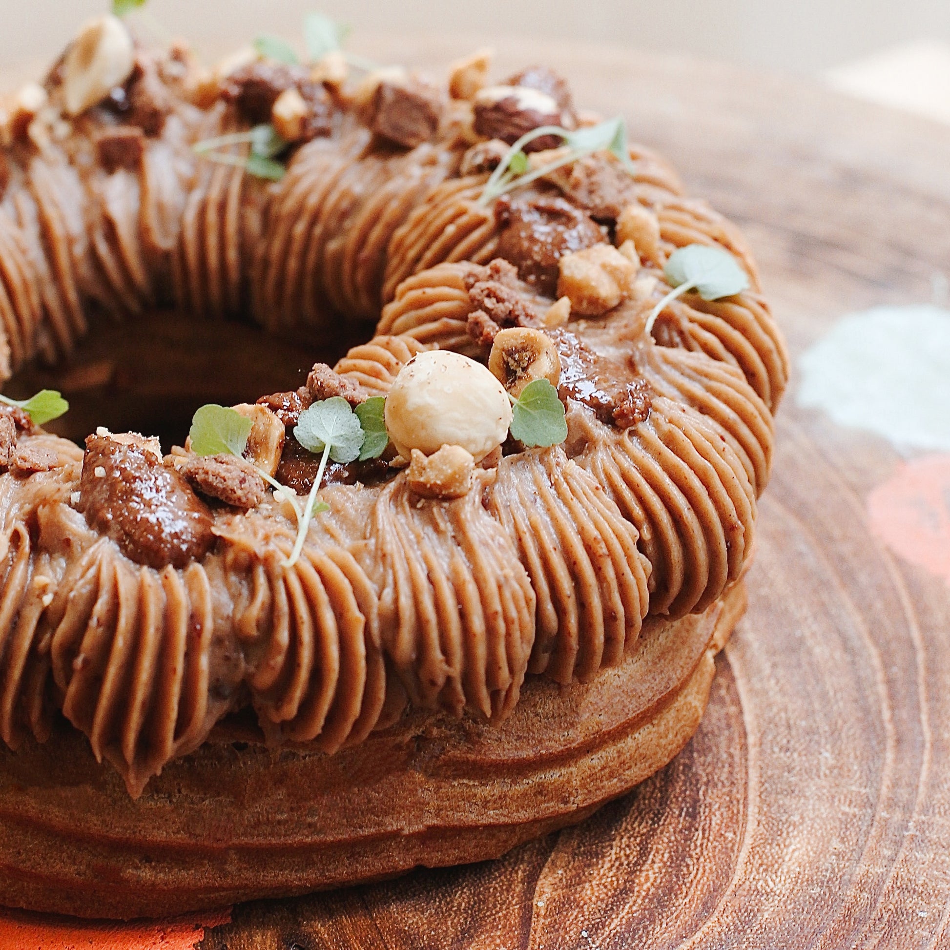 Pâte à choux, praliné amande-noisette, crème mousseline pralin, noisette concassées, praliné noisette maison